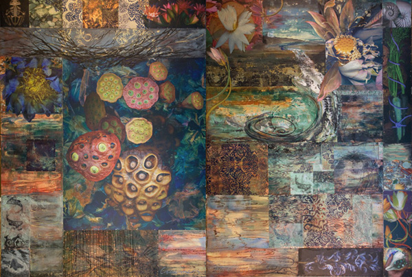 Passion for each other's work led to this integral creative engagement. Entering into a visual conversation with generosity of spirit, our process: collage-collocation-collaboration yields a new format for expression. Through mutual respect and trust, we seek balance in an untraveled world. (Our) co-laboring involves cross-disciplinary dialogue, and the development of skill sets that blend new technologies with traditional craftsmanship. Visually and conceptually free of conflict, our colling of ideas allows for us a new model of authorship.